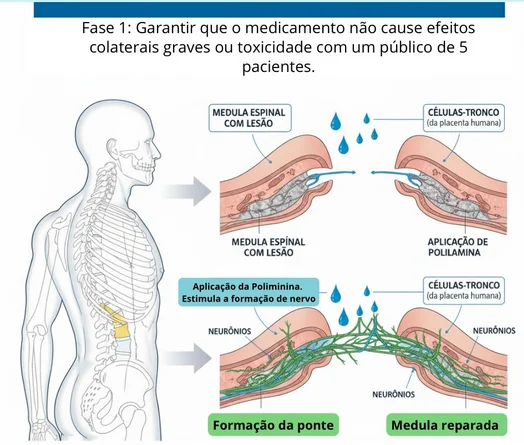 Essa fase tem como objetivo principal avaliar a segurança da polilaminina em seres humanos, e não comprovar sua eficácia terapêutica (a avaliação de eficácia requer o cumprimento das etapas regulatórias subsequentes previstas pela Anvisa, com a condução de estudos clínicos desenhados especificamente para esse fim). Os testes iniciais serão conduzidos em pacientes com lesões torácicas recentes da medula espinhal, seguindo critérios rigorosos de inclusão, monitoramento e acompanhamento clínico.